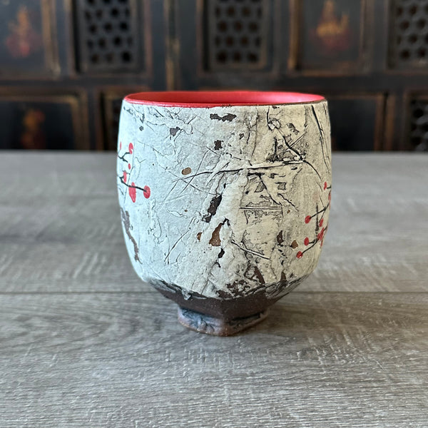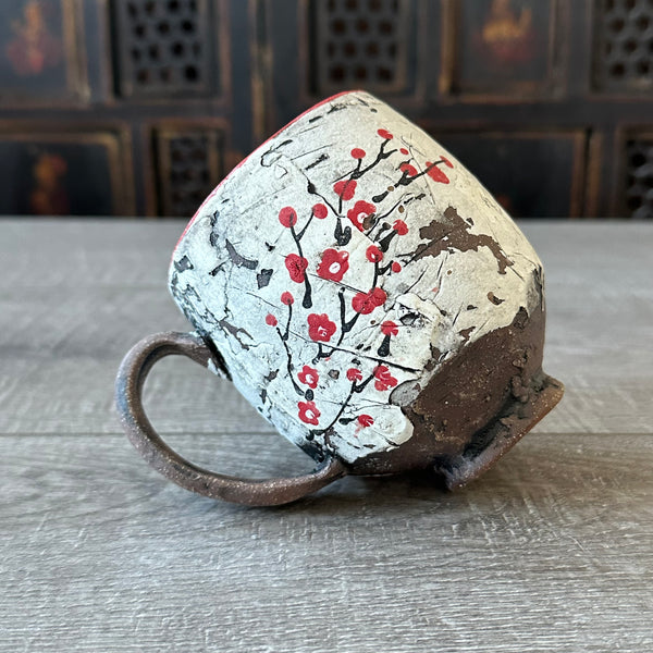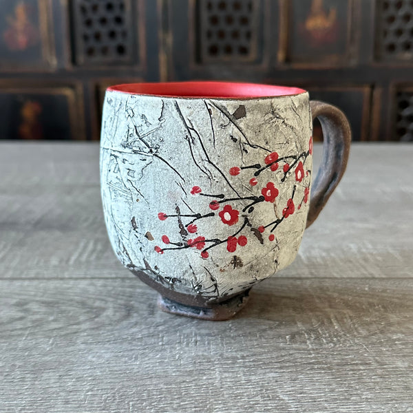 I make this mug on the potters wheel and once the rim is dry enough to support itself, I turn it over and trim the bottom. Then while it is still very wet, I modify it with a few selectively placed dings and scrapes before applying slip to newsprint paper that is transferred on to the pot. This allows me to layer the slip and to acquire a stucco appearance, much like on an old building. After it comes out of the first firing, I apply a black wash for an antiquing appearance to the outside of the pot and a matte red glaze to the inside and a while matte glaze on the outside rim. Then after the wash, I paint my cherry blossom motif and it is left unglazed. Then the pot goes back in the kiln the for its second and final firing.  After it comes out of the glaze kiln, the outside of the mug is then wet sanded for a super smooth finish.