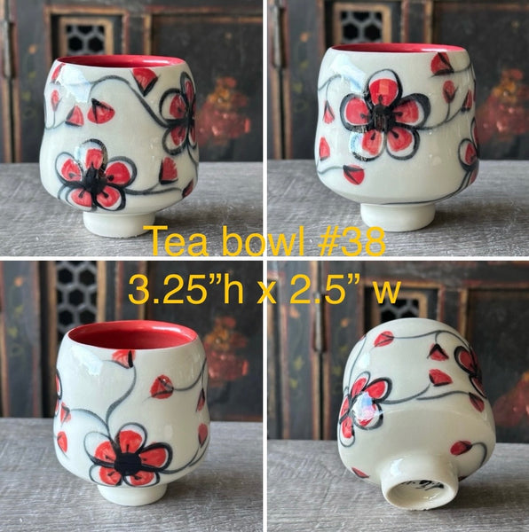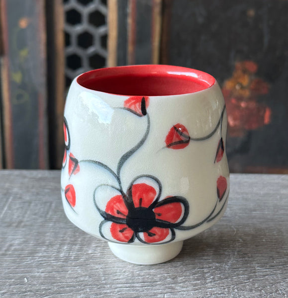 I use the potter's wheel to create this wine cup. I make the cup one day and then trim the bottom foot the next day. I let it dry completely and then paint red plumflowers and a trailing vine on it. Recently I have modified this design and changed the vine from green to black and added bigger flower buds. The simplification of the colors really makes the design pop. I started this design over 12 years ago. It's been fun and interesting to see it evolve into its present rendition. A red slip is applied to the inside of the wine cup, then a clear glaze finishes the cup the inside and outside. Made from high fire grolleg porcelain and fired in an electric oxidation kiln.