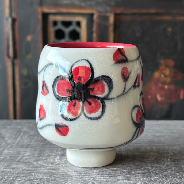 Hand painted plumflower wine cup with red plumflowers
