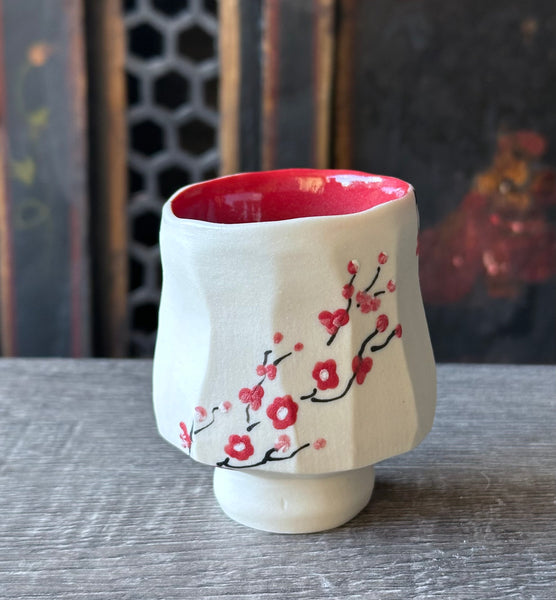 Faceted, hand painted sake cup with red cherry blossoms. Doubles well as an espresso cup or Turkish coffee cup.
