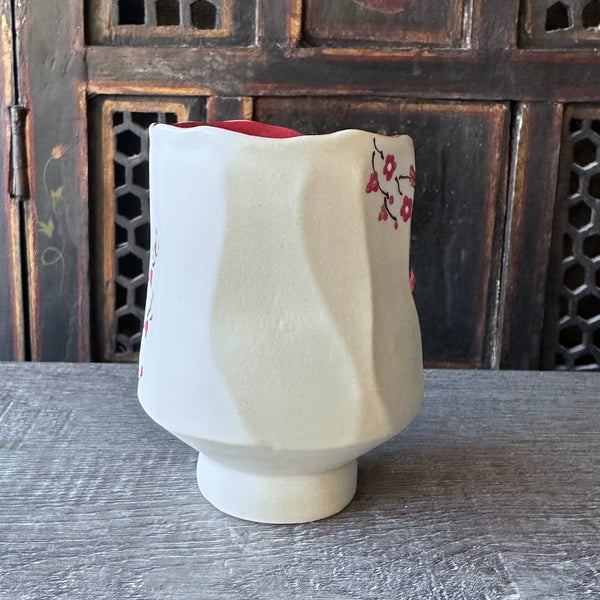 Faceted, hand painted yunomi with red cherry blossoms. Doubles well as a wine cup or ice cream bowl.