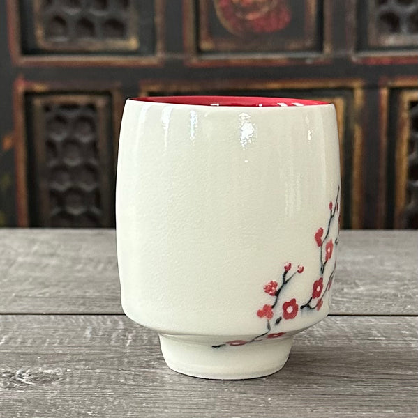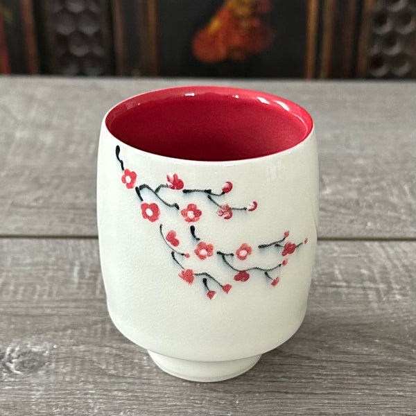 Faceted, hand painted yunomi with red cherry blossoms. Doubles well as an espresso cup, wine cup, or Turkish coffee cup.