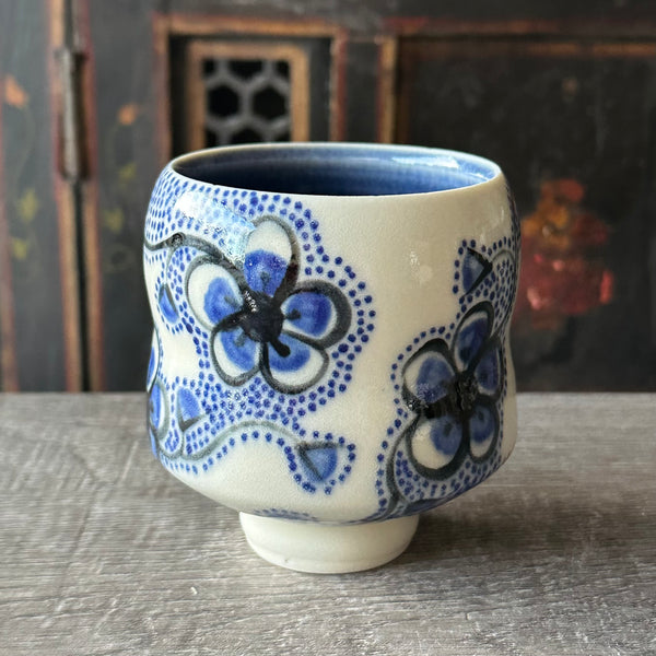 I use the potter's wheel to create this tea bowl. I generally make the tea bowl one day and then trim the bottom foot the next day. I let it dry completely and then paint blue plumflowers and a trailing vine on it. I have been painting this design since I returned to pottery more than 12 years ago. It's been fun and interesting to see it evolve into its present rendition. This version has blue flowers, black outlines, large flower buds, and mesmerizing royal blue dots that creates visually appealing empty spaces. A clear glaze finishes the tea bowl on the outside and a coordinating blue glaze is on the inside. Made from high fire grolleg porcelain and fired in an electric oxidation kiln.