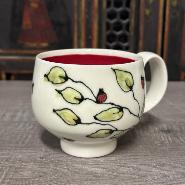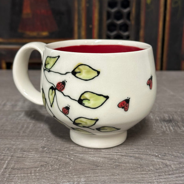 I use the potter's wheel to create this mug. I generally make the body of the mug one day, trim the bottom foot the next day and add attach handle. I then let it dry completely and then paint lady bugs and leaves on the outside and apply a red slip to the inside of the mug. I started painting this design more than 12 years ago and it continues to evolve. A clear glaze finishes the mug, on the inside and outside. Fired in an electric oxidation kiln.