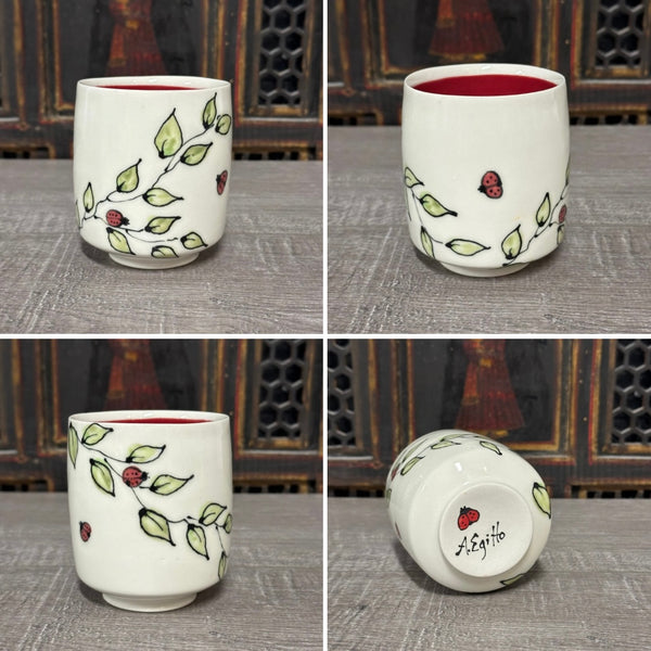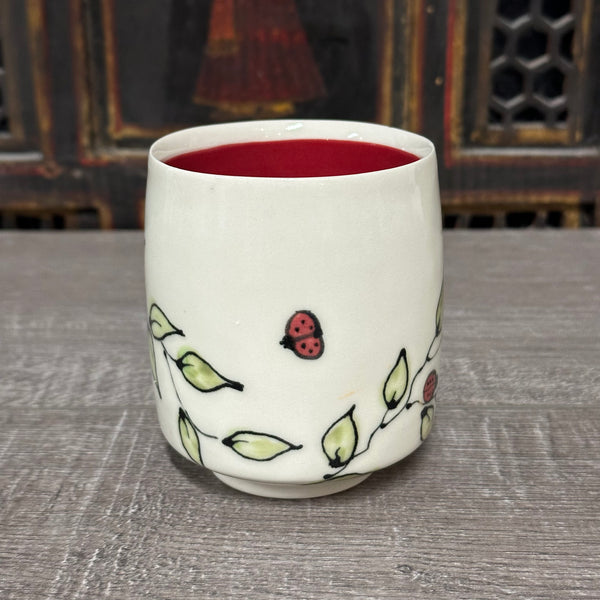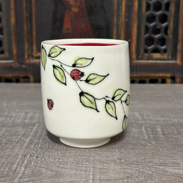 I use the potter's wheel to create this cup. I generally make the body of the cup one day, trim the bottom foot the next day. I then let it dry completely and then paint lady bugs and leaves on the outside and apply a red slip to the inside of the cup. I started painting this design more than 12 years ago and it continues to evolve. A clear glaze finishes the yunomi, on the inside and outside. Fired in an electric oxidation kiln.